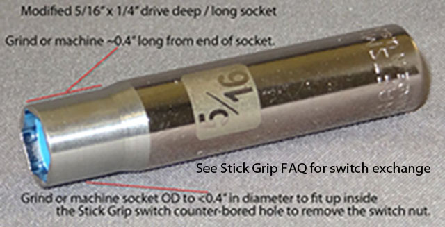 Our Stick Grip has a 1" diameter hole in the bottom to allow your stick tube to fit 2.125" up inside it *.gif . A 29/64" hole is drilled 0.5" down from the top of your stick tube (at the proper clock code to ergonomically fit your hand and wrist) for the Stick Grips lower boss and screw to clamp through, and the Stick Grip halves to clamp over. You DO NOT *ever* glue our Stick Grip to your stick tube!!! NOTE: at Oshkosh 2003, we were told of an RV-8 builder who was killed when his glued on rubber grip he was using as a stick grip in his plane came loose and UP, jamming into the underside of the instrument panel!!! Spacers are available if your aircraft stick tube OD is less than, or greater than, a standard 1" OD stick tube (i.e. -- to fit Lancair 200's, 235's, 320's, 360's and older Legacy's (newer Legacy's are now 1" stick tubes), use a short 3/4" spacer ; for Canard's, Lancair IV's, Lancair ES and the Nemesis NXT, use a long 3/4" spacer ; or to fit the Van's RV-4, 6, 7, 8, & 9, and Harmon Rocket, co-pilots' -- and the Van's RV-10's, RV-12's, RV-14's, Glasair's, Glastar's, F-1 Rocket's and Expresses pilot AND co-pilot -- use a 7/8" spacer to adapt your aircraft's stick tube). For the larger 1.125", 1.25", 1.375" or any size OD stick tubes -- such as used in military aircraft, Mig's, T-38's, L-39's, T-34's, P-51's, SN-J's/T-6's, Yak's, Marquette's, and Falco's, for example -- a custom 5" long spacer will fit inside your larger than 1" OD stick tubes ID nicely (see price below, and provide your stick tube ID, if you want us to make it for you). A simple Stick Grip Installation Drawing is provided with your Stick Grip order (see "How to Install" *.pdf above). The Stick Grip splits in half for *very* easy maintenance. Replacement parts can be easily installed by you, and are available by simply contacting INFINITY Aerospace via the Excel order form in the pricing section below. NO other Stick Grip in the world has this much versatility at this low of a price!