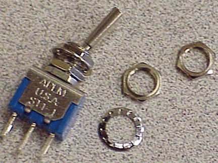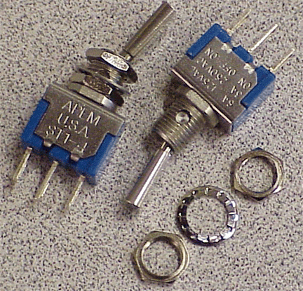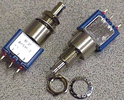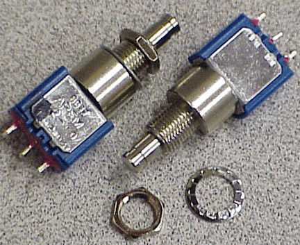 Positions 3, 4, 5 & 6 can be changed from the standard ON/OFF SPDT Push-button (P/N: 8636) configurations to Normally Open (N.O.) or Normally Closed (N.C.) Momentary SPDT Pushbuttons (P/N's: 8632 N.O. or 8632 N.C.) for Transponder Ident., Autopilot Disconnect or Flight Management Control. Also, a ON/Center OFF/Momentary (ON) [P/N: 5638], OR spring loaded-to-center (ON)/OFF/(ON) [P/N: 5637], SPDT 6A @ 12 VDC toggle switch (Relays required because the switch is a SPDT and you need to reverse your Flap / Speed Brake motor, NOT because the switch will not handle the Amp's (this also keeps the wire OD small) -- Radio Shack Catalog # 275-218 with Socket # 275-220, both made by Potter-Brumfield, for example) can be installed in position #3 for Flaps, Speed Brakes, Canard Belly Board or Wing Spoilers; #5 &/or #6 can be a spring loaded-to-center SPDT 6A @ 12 VDC [P/N: 5637] toggle switch (Relays required) for Flaps, Speed Brakes, Canard Belly Board, Wing Spoilers, Cowl Flaps, Rudder Trim, Aileron Trim, etc. ALSO, we have ON/OFF/ON (P/N: ST1-2), ON/NONE/ON (P/N: ST1-1) and ON/OFF (P/N: 10TA320) Toggle Switches.